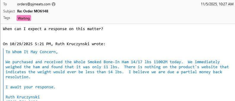 Happy with the flavor, not satisfied with the product size or your customer service. Immediately following receipt of the ham, I sent the following to [****] and have not received a reply yet: "We purchased and received the Whole Smoked Bone-In Ham 14/17 lbs 11002M today. We immediately weighed the ham and found that it was only 11 lbs. There is nothing on the product's website that indicates the weight would ever be less than 14 lbs. I believe we are due a partial money back resolution. "